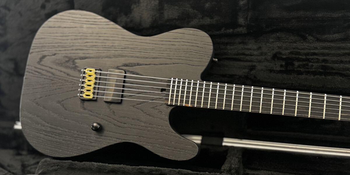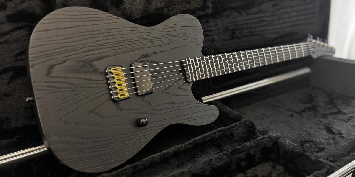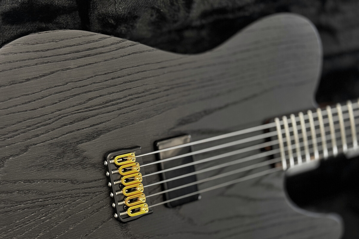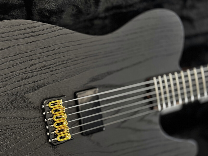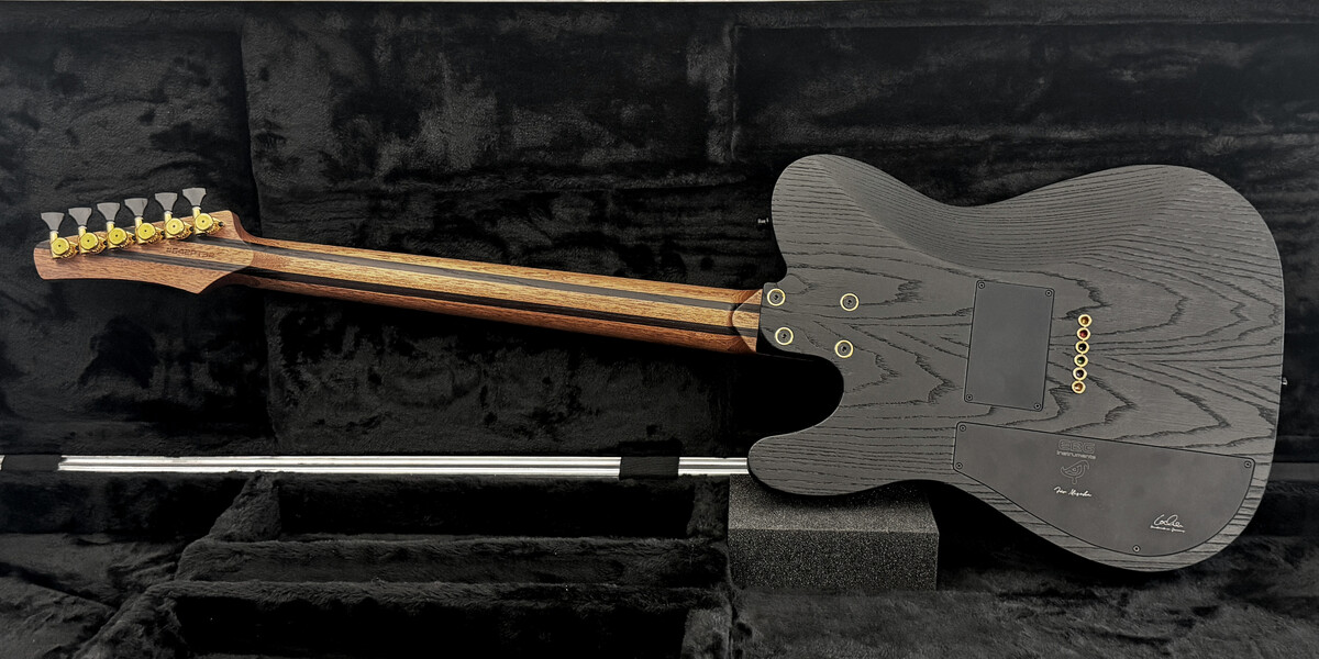 The guitar has 24 frets, compound radius, hidden screw connections and an cool rough finish in open pored satin black.